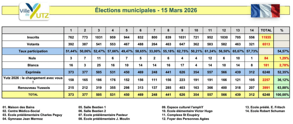 Vous avez été 3991 à nous accorder votre suffrage, soit 75% de plus qu’en 2020, confirmant ainsi le soutien croissant à notre démarche et à la vision que nous portons pour Yutz. Ce résultat montre une chose essentielle : le rassemblement qui s’est exprimé est d’abord un rassemblement YUSSOIS, construit autour d’un projet pour notre ville, et non autour d’enjeux nationaux.